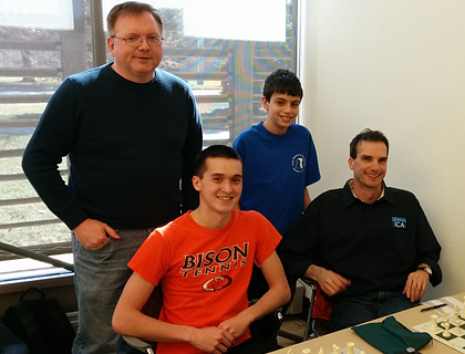 Chess fathers and sons: Martin Wilber, expert Matthew Wilber, Adam Wallach, NM Ken Wallach, before round 4, Evanston Tri Level, March 21, 2015